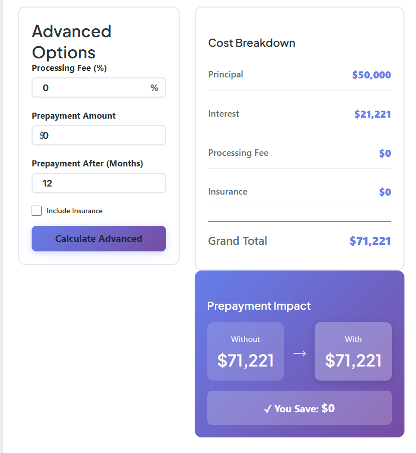 Our calculator goes beyond the basics. The “Advanced” tab allows you to input the Processing Fee, a one-time charge for setting up your LIC Housing Loan. Factoring this in gives you the true cost of borrowing. The Prepayment field is a powerful feature for strategic planning. Here, you can simulate the effect of making extra payments toward your principal, showing you how to become debt-free faster and get the most out of your LIC Housing Loan.