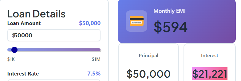 - Calculation: At an 8.6% interest rate, a 30-year tenure results in an EMI of approximately $1,109. A 20-year tenure increases the EMI to $1,260.