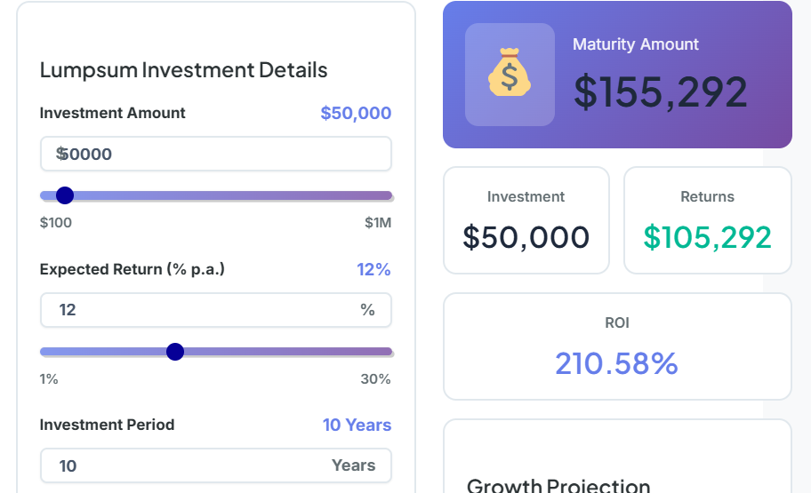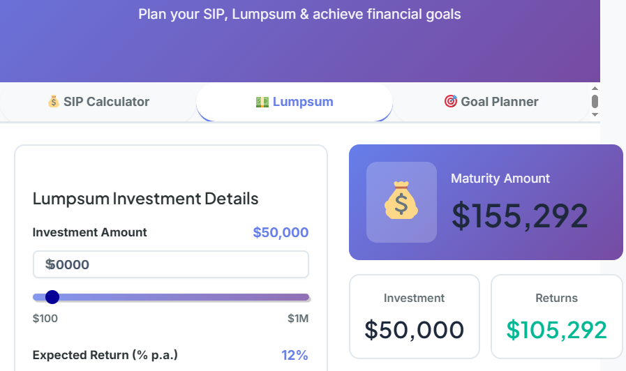 - Variable Contributions: If you plan to invest $50k now and then add $5k every year, you can’t do it in one shot here. You would need to run the Lumpsum Calculator for the $50k, and a separate SIP-style calculation for the annual additions, then sum them up.