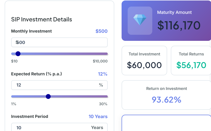 David realizes that while this triples his money, it isn’t enough to retire on alone. The Lumpsum Calculator helps him realize he needs to supplement this with monthly contributions. He navigates to the sips cost calculator to see how much extra he needs to add monthly to reach his $500,000 goal.